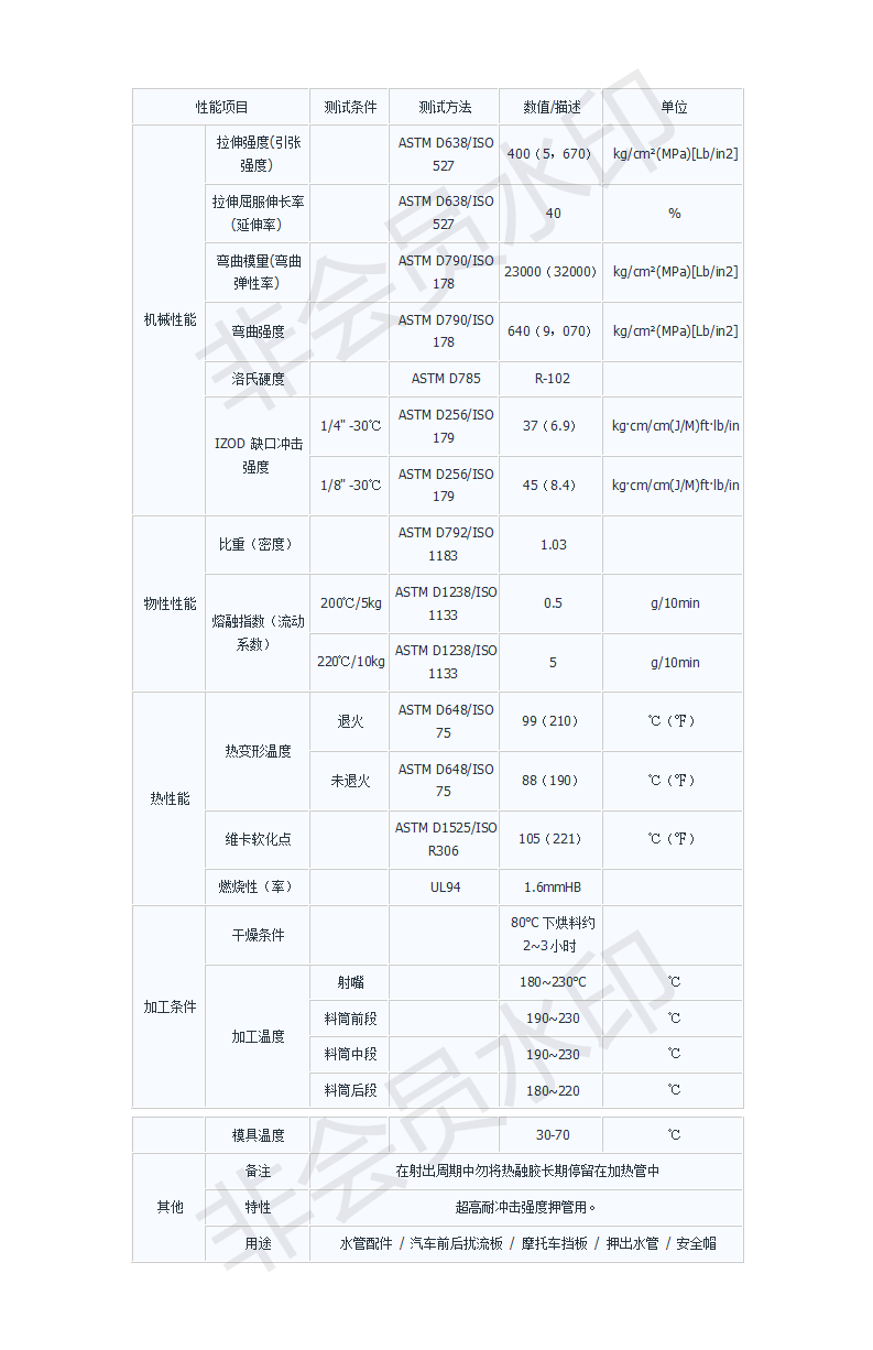 1、無定形材料,流動性中等,吸濕大,必須充分干燥,表面要求光澤的塑件須長時間預熱干燥80-90度,3小時;